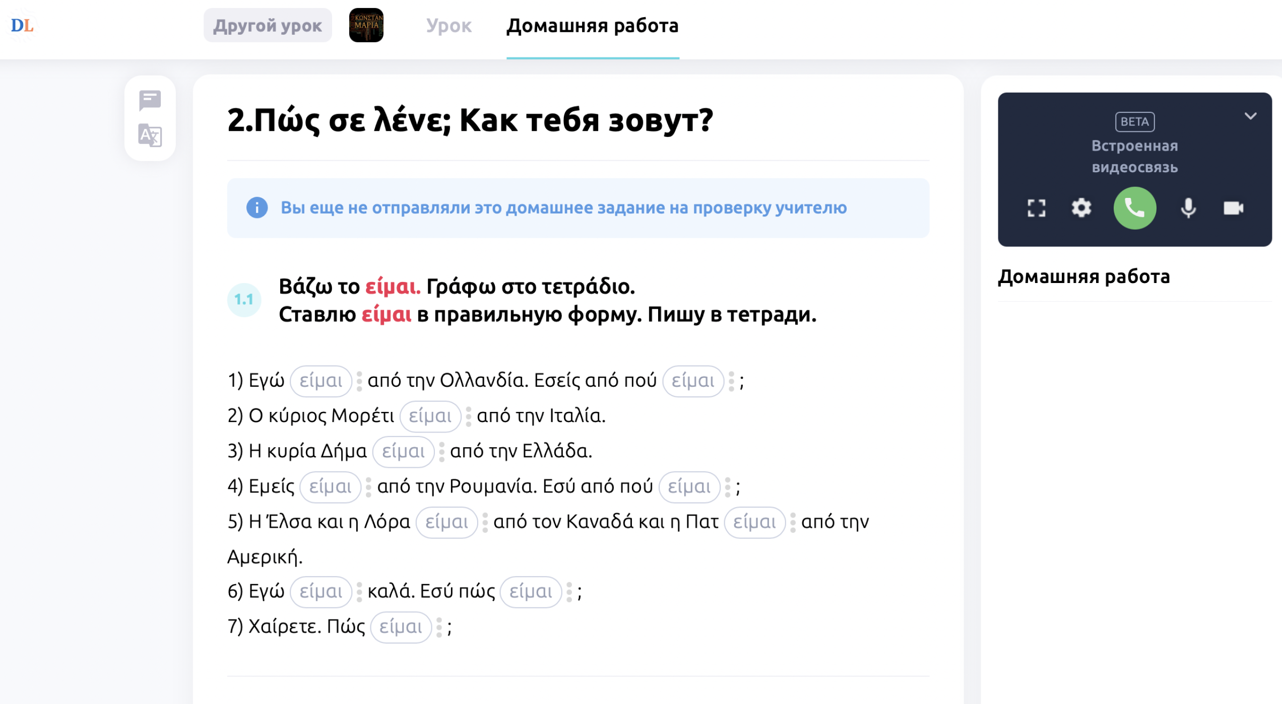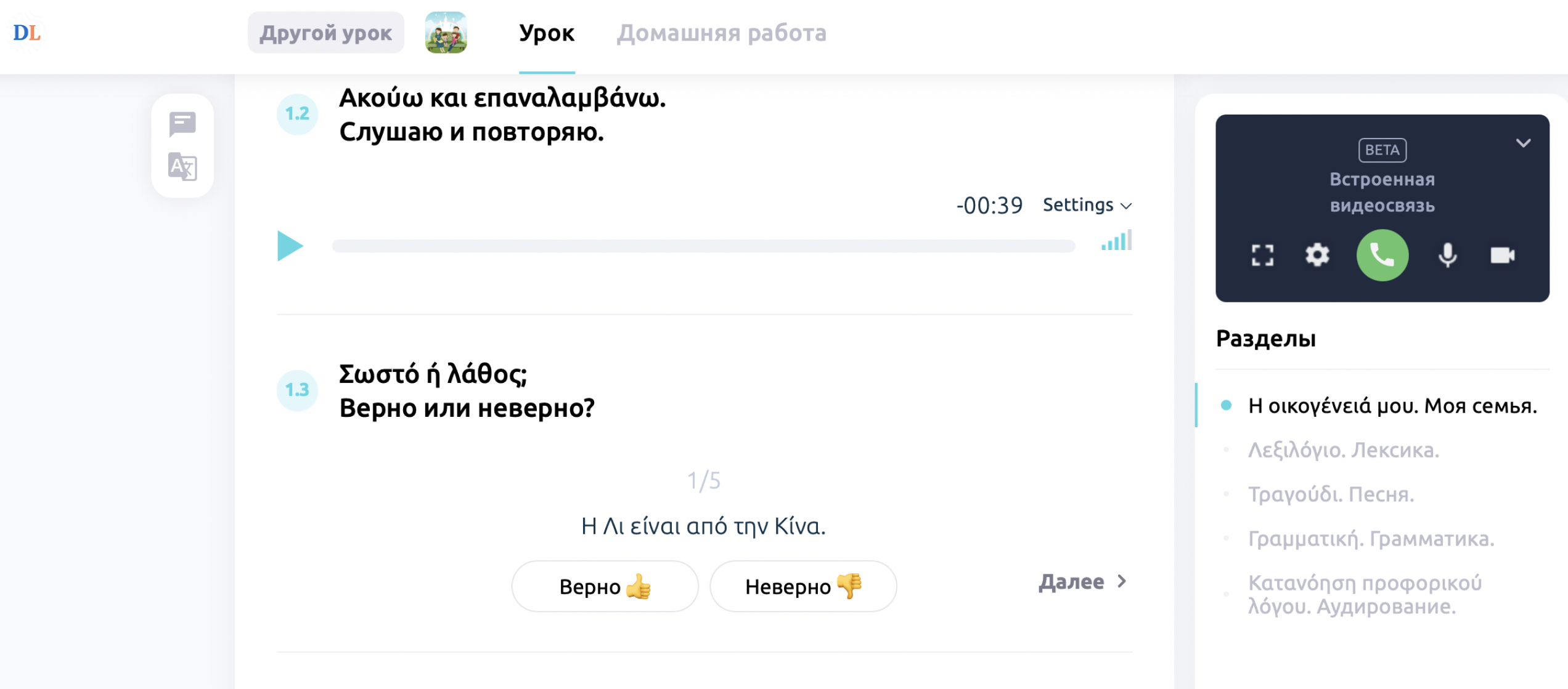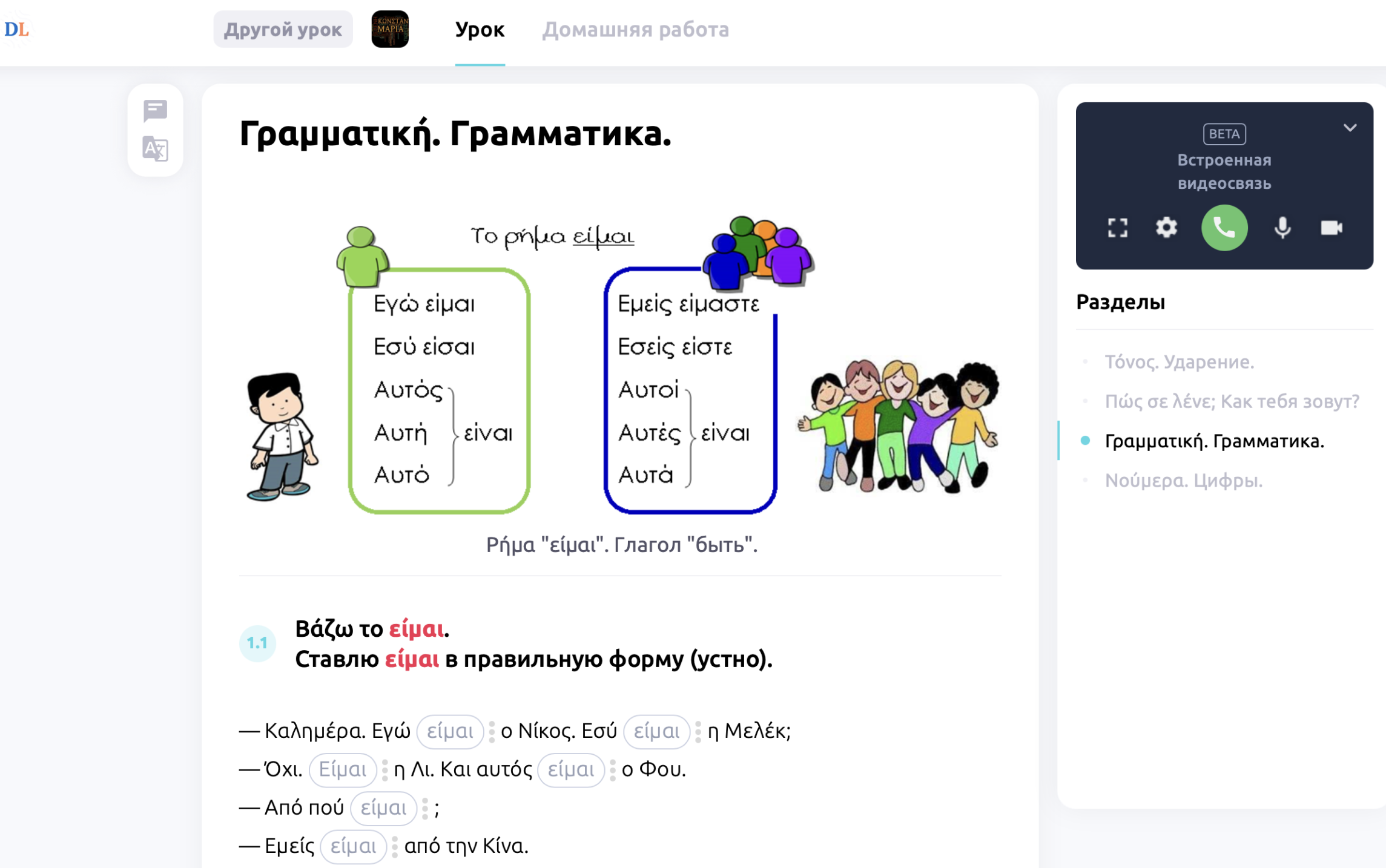 Об остальном позаботится языковая школа Divelang! Мы предоставим доступ к современной интерактивной платформе, где собрана и структурирована огромная база полезной информации, есть учебные тренажеры и видеоуроки. Эффективность нашей платформы уже доказана сотнями учениками, которые прошли обучение греческому языку и другим языкам, например, у нас можно записаться на самостоятельное обучение немецкому. Получите пробный доступ бесплатно и оцените возможности сервиса прямо сейчас!